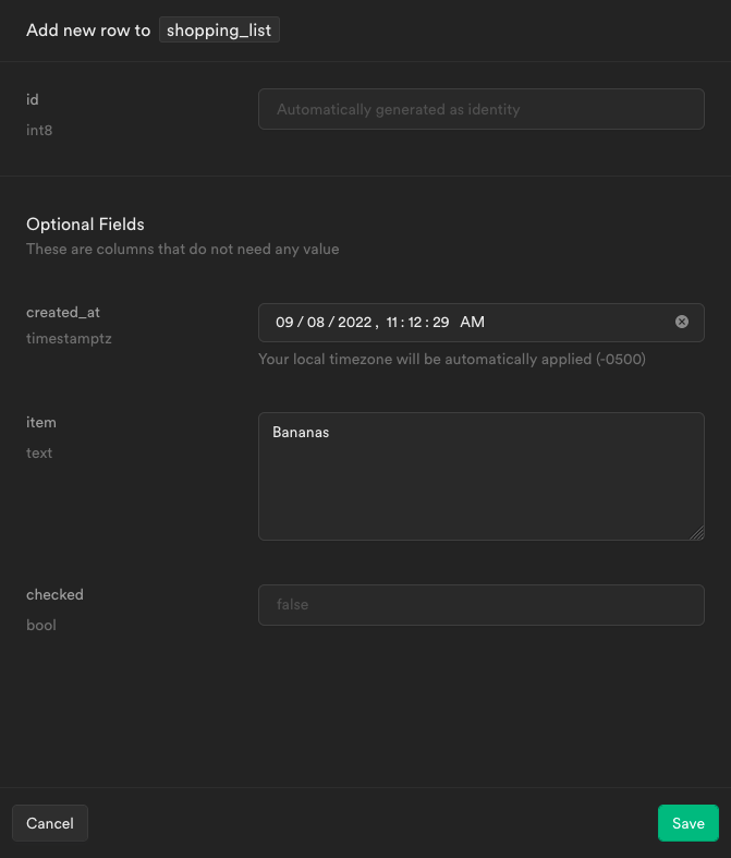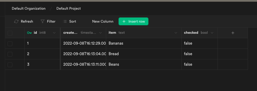 - You should now be on the Table Editor page for the table, and can input new rows of data using the + Insert row button. - Create several entries in this table, entering an - itemvalue for each. All of the other columns populate automatically.- You can also accomplish this using the SQL Editor option in the left menu. From there, you can use the SQL - insertstatement below to add the desired rows:- insert into shopping_list (item) values ('Bananas'), ('Bread'), ('Beans') ;