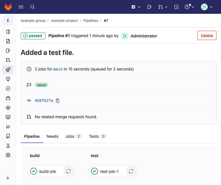 1 2 3 4 5 6 7 8 9build-job: stage: build script: - echo "Built!" test-job-1: stage: test script: - cat test-content.txt